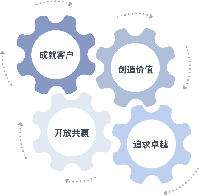 成就客户是一切决策的出发点,,,,创造价值是衡量所有工作的标准,,,追求卓越是我们做事做人的态度,,,开放共赢是我们的格局也是最终的结果。。价值观的齿轮环环相扣,,推动着组织里的每个人不断向前。。。。
